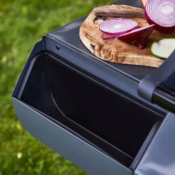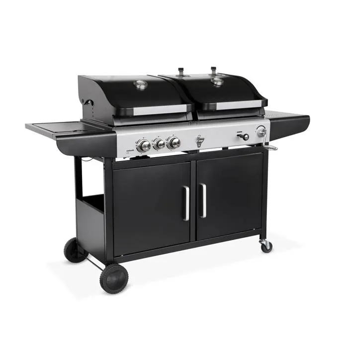Descripción del producto: Barbacoa de 4 quemadores – Diseño único en color gris metalizado – Potencia excepcional de 15,1 kW – Amplia superficie de cocción con sistema FlexiGrill de 64 x 41,5 cm para accesorios de cocina opcionales – Incluye plancha redonda – Quemador lateral para salsas y guarniciones – Accesorios, cesta para condimentos y ganchos para utensilios – Amplia rejilla para calentar que se despliega al abrir la tapa, con termómetro integrado – Sobre un carro, equipado con 2 estantes laterales y 2 puertas – Funda protectora incluida con la barbacoa