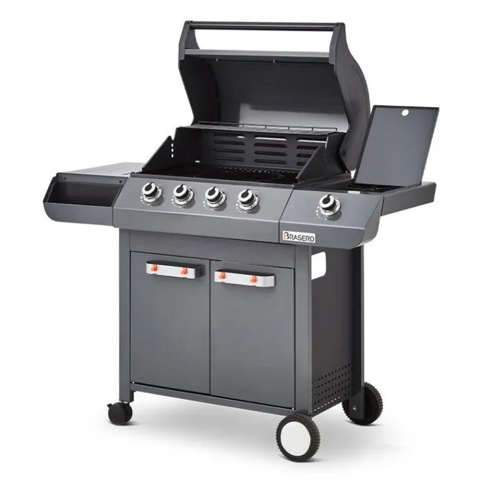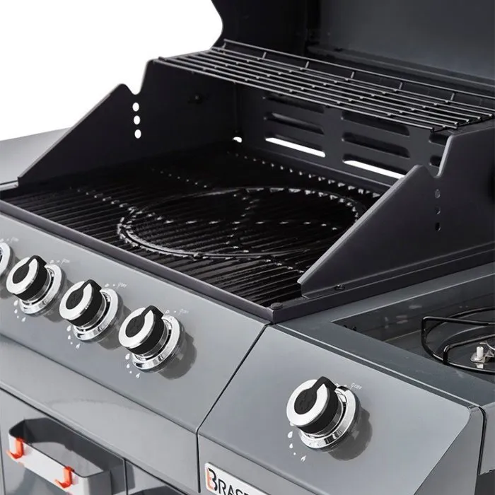 Con su elegante diseño en gris metalizado, la barbacoa de gas Emma de 4+1 quemadores es práctica y potente para tus reuniones sociales. Apreciarás su amplia superficie de cocción de 64 x 41,5 cm y su sistema de cocción múltiple FLEXIGRILL. Transforma tu barbacoa en una auténtica cocina al aire libre. Date el gusto con la barbacoa Emma.